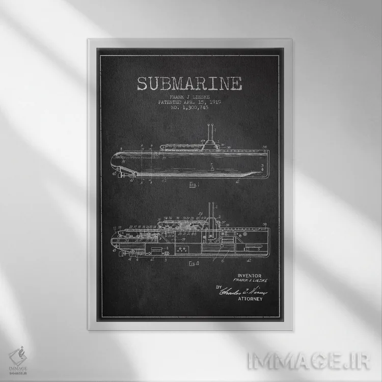 اگر دکور شما کلاسیک/رترو است، «نقشهٔ ثبت اختراع زیردریایی (زغالی)» اثرِ «پیکسل کهنه (استودیو/نام هنری)» با سبک هنری کاملاًً مینشیند.