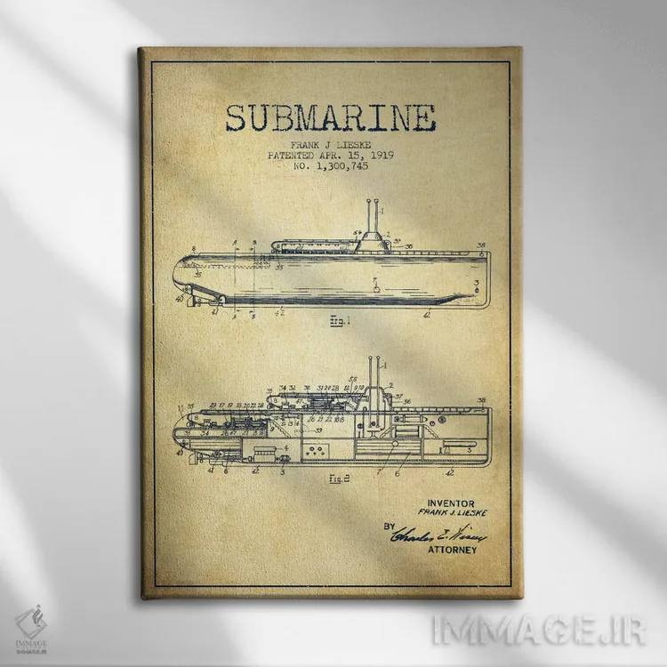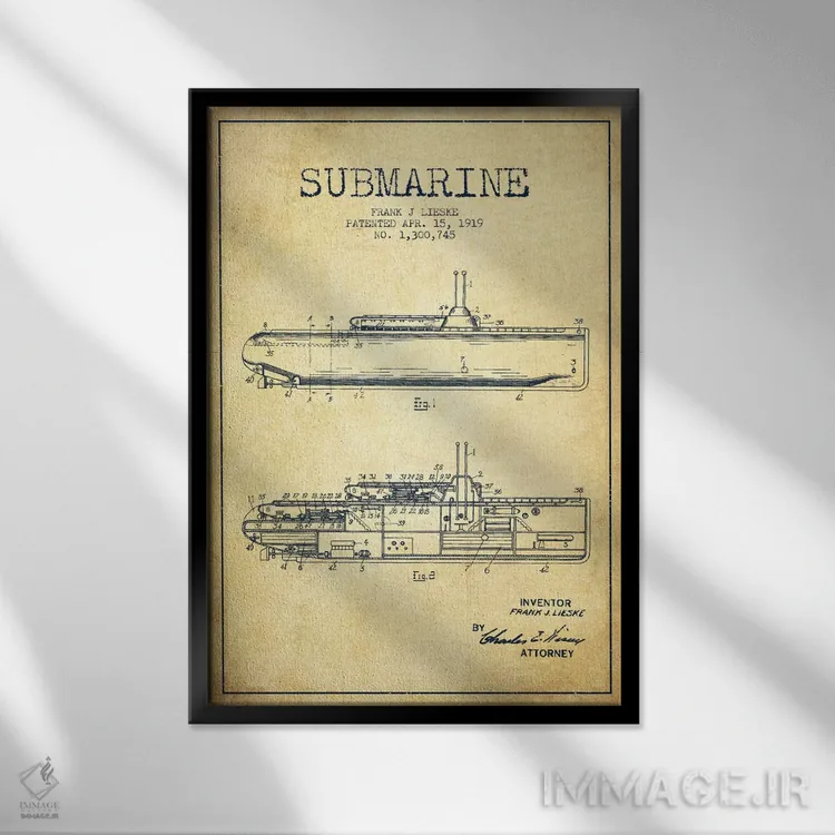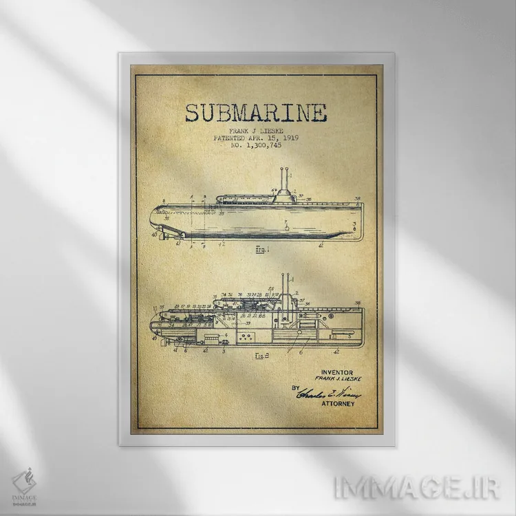 در «نقشهٔ ثبت اختراع زیردریایی (وینتیج/قدیمی)» اثرِ «پیکسل کهنه (استودیو/نام هنری)»، موضوعِ این اثر با زبانِ رترو روایت میشود؛ هم خاص است هم دکورپذیر.