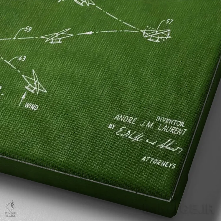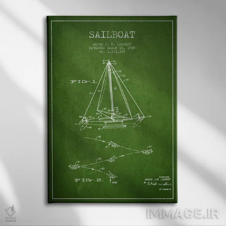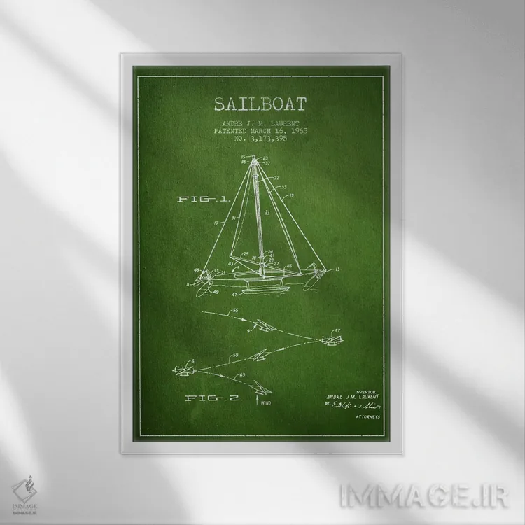 «نقشهٔ ثبت اختراع قایق بادبانی دو سر (سبز)» اثرِ «پیکسل کهنه (استودیو/نام هنری)» اگر به جزئیات کلاسیک و حس قدیمیِ شیک علاقه دارید، گزینهی خوبیست.