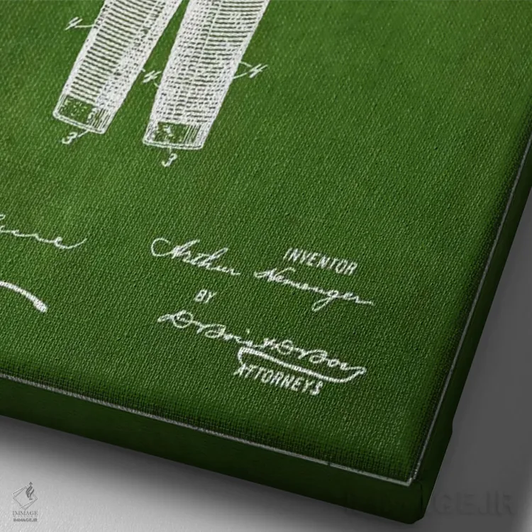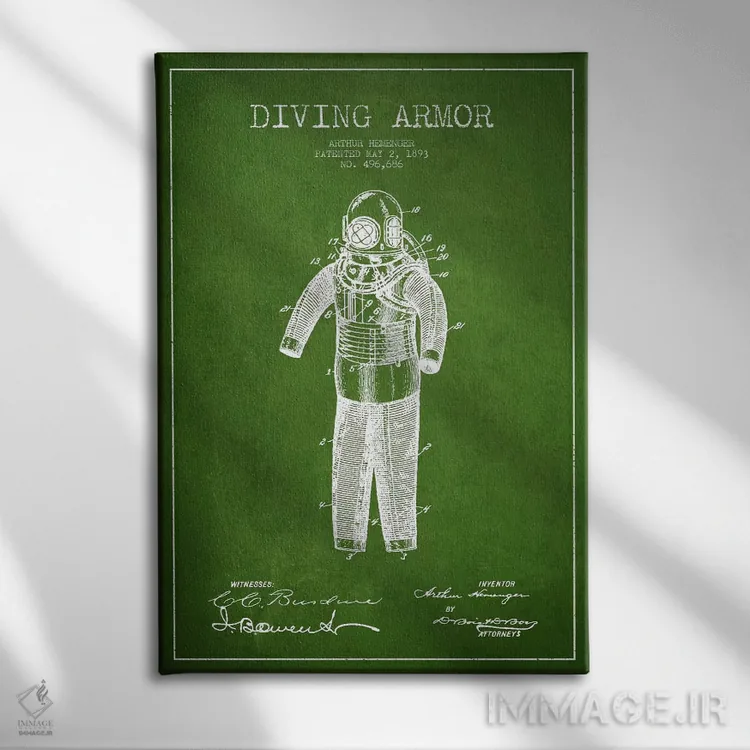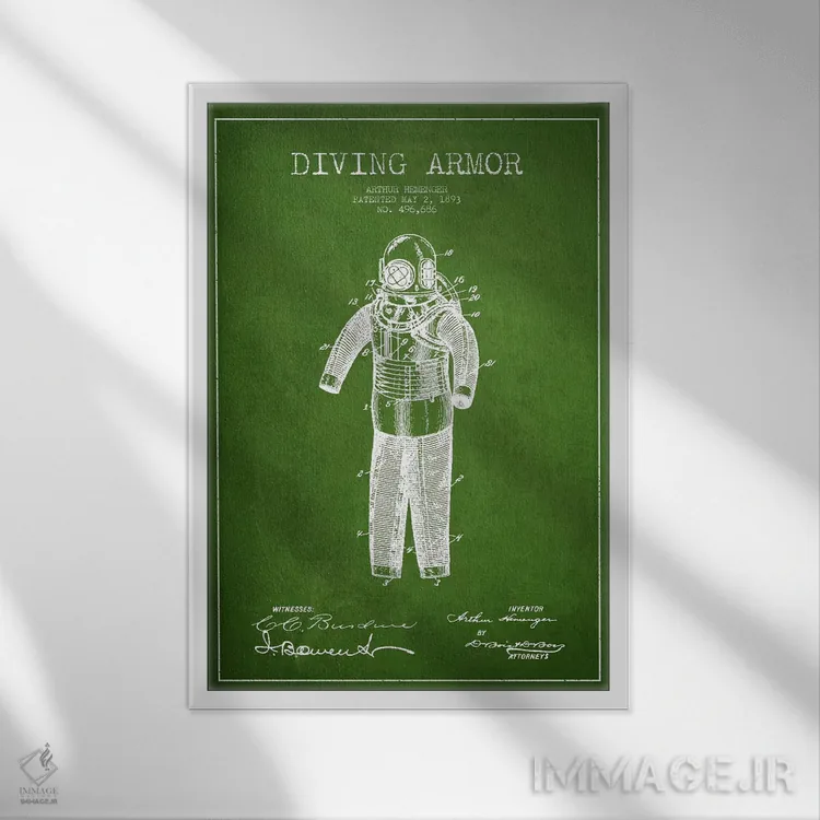 تابلو دکوراتیوِ «نقشهٔ ثبت اختراع لباس غواصی (سبز)»؛ مناسب برای فضاهایی با چوب تیره، چراغهای گرم و اکسسوریهای کلاسیک اثرِ «پیکسل کهنه (استودیو/نام هنری)».