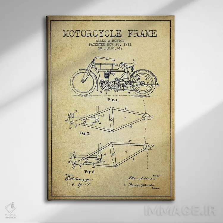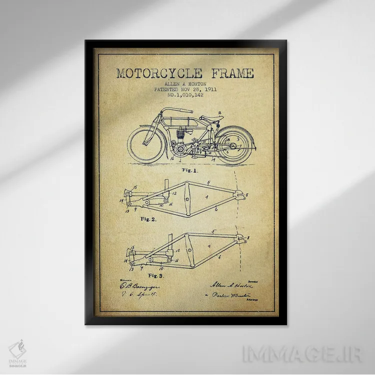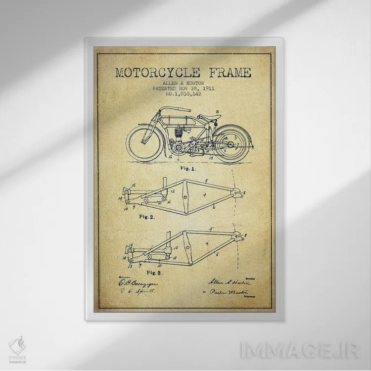 در «طرح ثبت اختراع شاسی موتورسیکلت آلن ای. هورتون (وینتیج/قدیمی)» اثرِ «پیکسل کهنه (استودیو/نام هنری)»، رنگها و فرمها یادآور پوسترهای قدیمیاند؛ انتخابی جذاب برای کافهاستایل و دکورهای شهری.