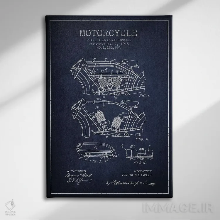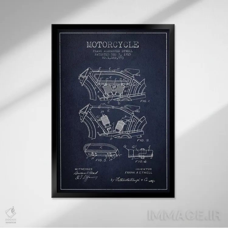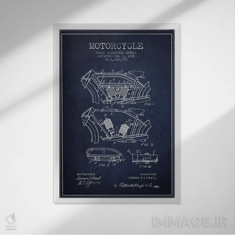 «طرح پتنت موتورسیکلت فرانک آ. اتول (آبی نفتی)» اثرِ «پیکسل کهنه (استودیو/نام هنری)» برای راهرو، ورودی یا دیوارهای کوچک هم گزینهی خوبیست؛ چون حسش فوری منتقل میشود.