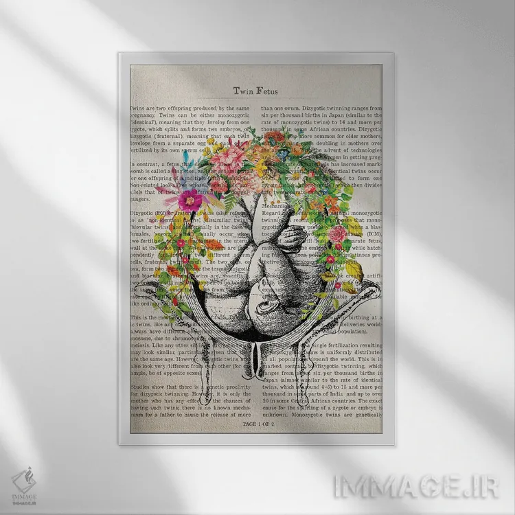 تابلو دکوراتیو چاپ آناتومی دوقلوها در رحم با گل اثر پیکسل کهنه