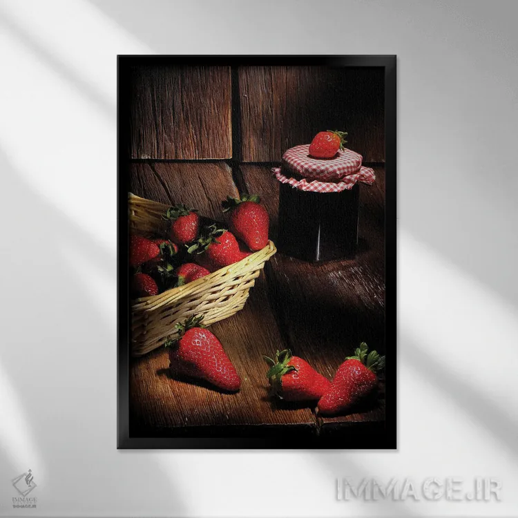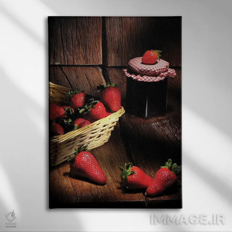 تابلو دکوراتیو توت فرنگی های قرمز و یک سبد روی میز چوبی اثر آلساندرو دلا توره
