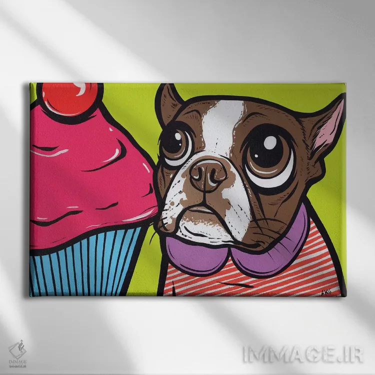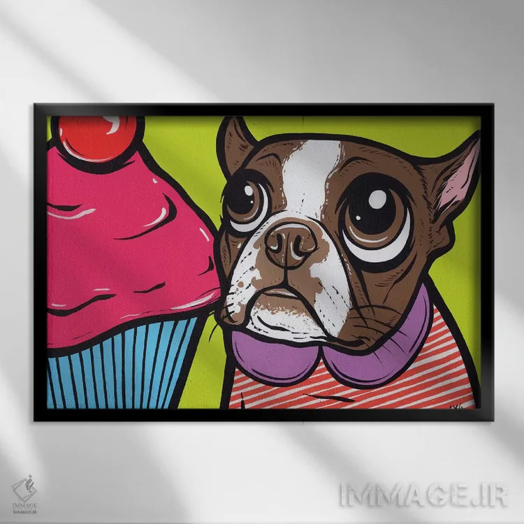 اگر میخواهید دیوار کمی سرزندگیِ محترمانه داشته باشد، «بوستون تریر قهوهای با کاپکیک» اثرِ «آلیسون گاتچل» به دیوار، انرژیِ نرم و زنده میدهد، برای دکورهایی با رنگهای خنثی گزینهٔ مناسبیست. با نورپردازی نقطهای، جذابتر هم میشود.