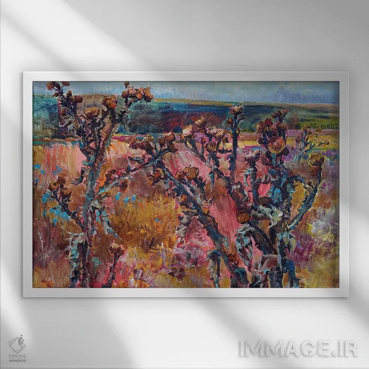 براساس پالت ترکیبی اثر، قاب تیک گرم (چوبی) پیشنهاد اول است و مشکی مات (فریم متوسط) مکمل. برای سفارشهای پروژهای با ابعاد و قابهای اختصاصی با ایماژ در تماس باشید.