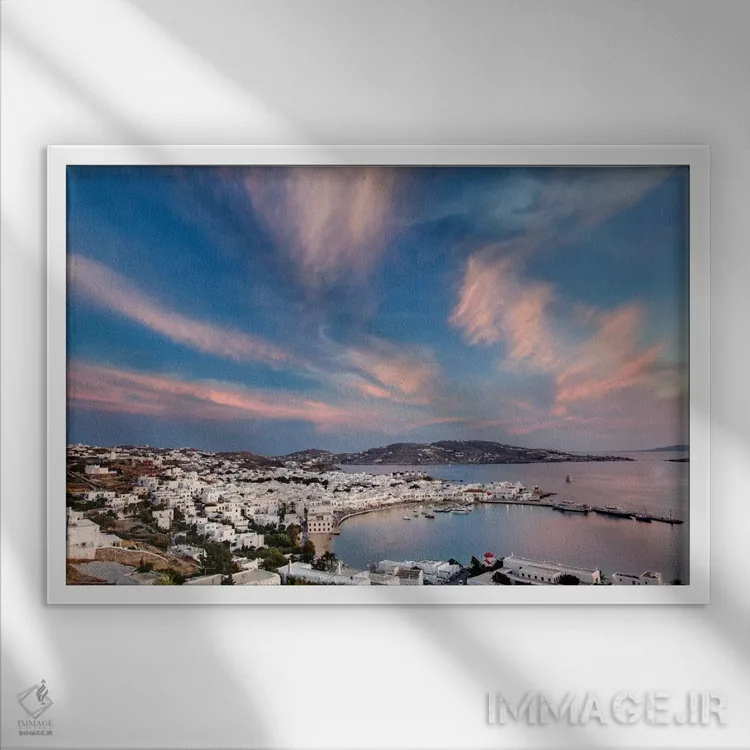 تابلو بندر دهکده، میکونوس، سیکلادها، یونان اثر آدام جونز - نمای قاب‌دار سفید