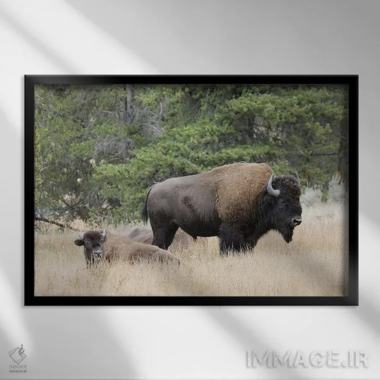 تابلو گاومیش امریکایی در پاییز، پارک ملی یلوستون، رود نِز پرس، وایومینگ اثر آدام جونز - نمای قاب‌دار مشکی