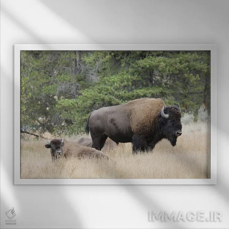 تابلو گاومیش امریکایی در پاییز، پارک ملی یلوستون، رود نِز پرس، وایومینگ اثر آدام جونز - نمای قاب‌دار سفید