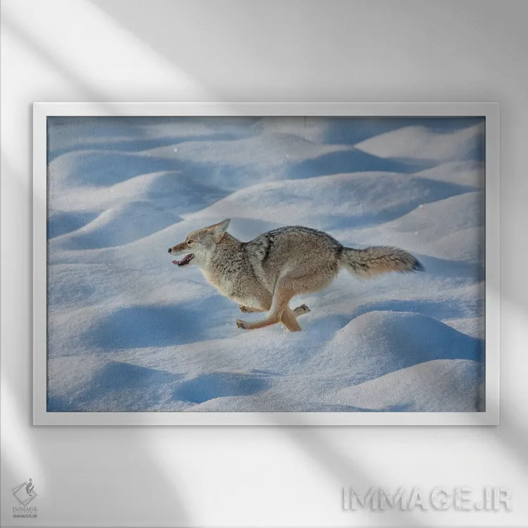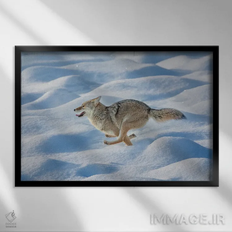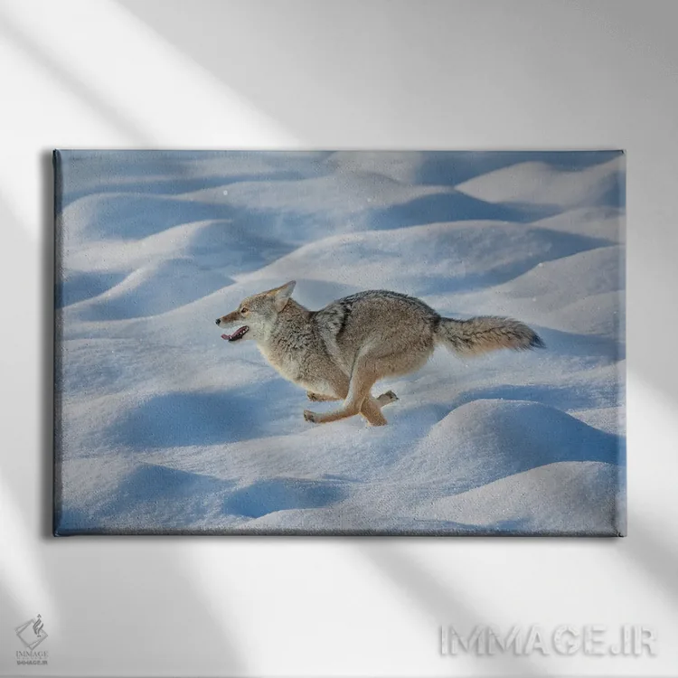 تابلو کایوت در حال دویدن میان برف تازه، پارک ملی یلوستون، وایومینگ اثر آدام جونز - نمای روبه‌رو روی دیوار