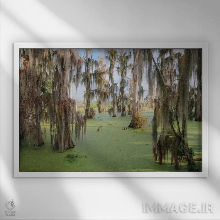 تابلو درختان سرو پوشیده از خزه اسپانیایی، مزرعه سیرکل بی، شهرستان پولک، فلوریدا اثر آدام جونز - نمای قاب‌دار سفید