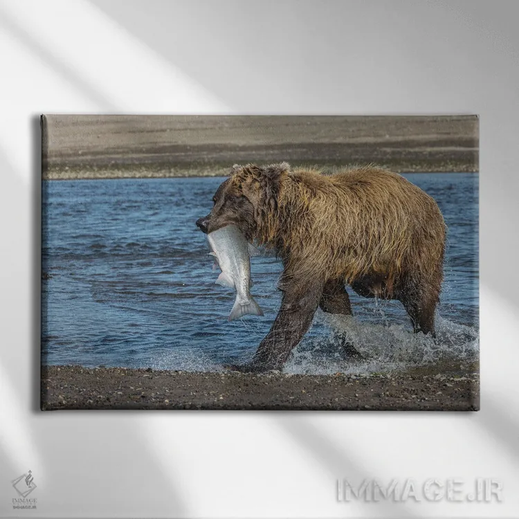 تابلو خرس گریزلی با ماهی سالمون در دهان، سیلور سالمون کریک، پارک ملی و منطقهٔ حفاظتشده لیک کلارک، آلاسکا اثر آدام جونز