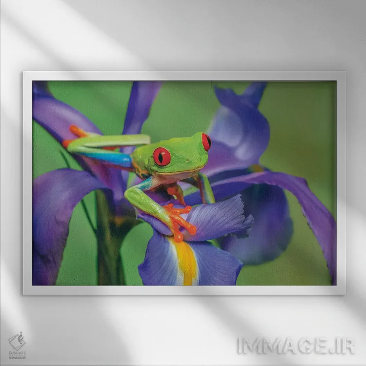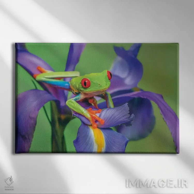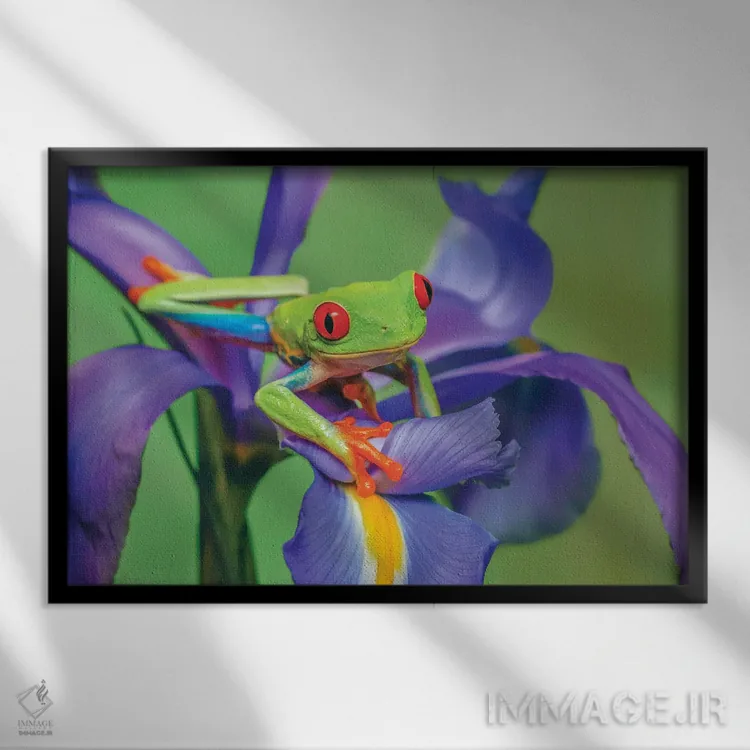 تابلو قورباغه درختی چشم‌قرمز در حال بالا رفتن از گل زنبق اثر آدام جونز - نمای روبه‌رو روی دیوار