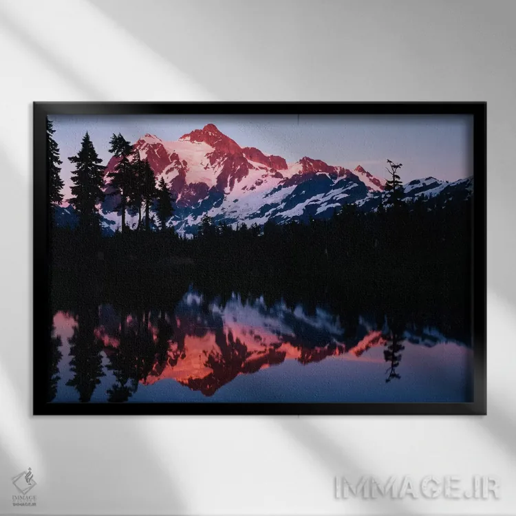 تابلو کوه شوکسان و انعکاس آن در دریاچهٔ پیکچر هنگام غروب، پارک ملی کاسکیدز شمالی، واشنگتن، آمریکا اثر آدام جونز - نمای روبه‌رو روی دیوار