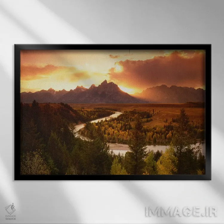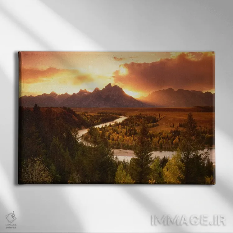 تابلو غروب بر فراز رشته‌کوه تتون با رودخانه اسنیک در پیش‌زمینه، پارک ملی گرند تتون، وایومینگ، آمریکا اثر آدام جونز - نمای روبه‌رو روی دیوار