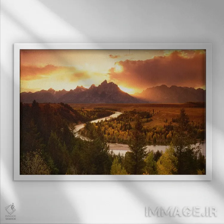 تابلو غروب بر فراز رشته‌کوه تتون با رودخانه اسنیک در پیش‌زمینه، پارک ملی گرند تتون، وایومینگ، آمریکا اثر آدام جونز - نمای قاب‌دار سفید