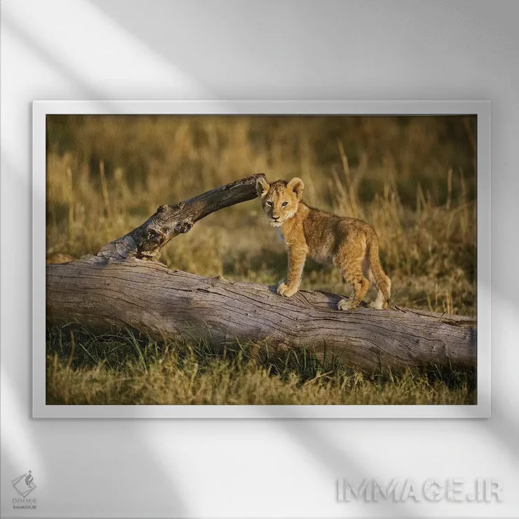 تابلو توله شیر روی کُنده، ماسایی مارا، کنیا اثر آدام جونز - نمای قاب‌دار سفید