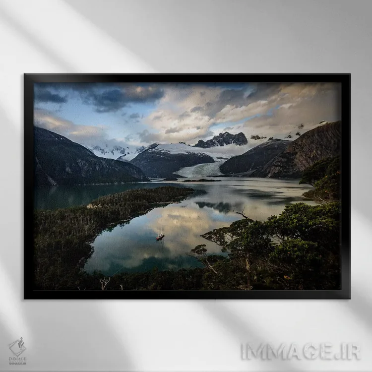 تابلو قایق اکتشافی پهلوگرفته در کالتا بیولیئو، کانال بیگل، مجمع‌الجزایر تیِرا دل فوِگو، پاتاگونیا اثر الکس بیوس - نمای قاب‌دار مشکی