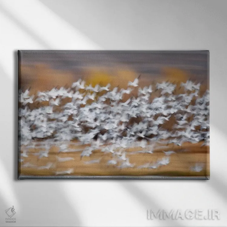 تابلو نمای حرکتی بلور دسته غازهای برفی در پرواز، پناهگاه ملی حیات وحش بوسکه دل آپاچی، نیومکزیکو، آمریکا اثر آرتور موریس - نمای روبه‌رو روی دیوار