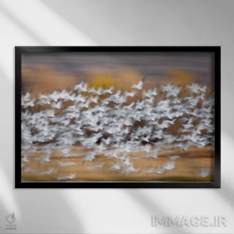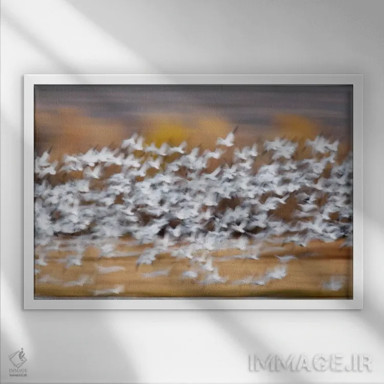 تابلو نمای حرکتی بلور دسته غازهای برفی در پرواز، پناهگاه ملی حیات وحش بوسکه دل آپاچی، نیومکزیکو، آمریکا اثر آرتور موریس - نمای قاب‌دار سفید