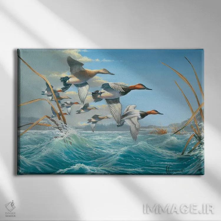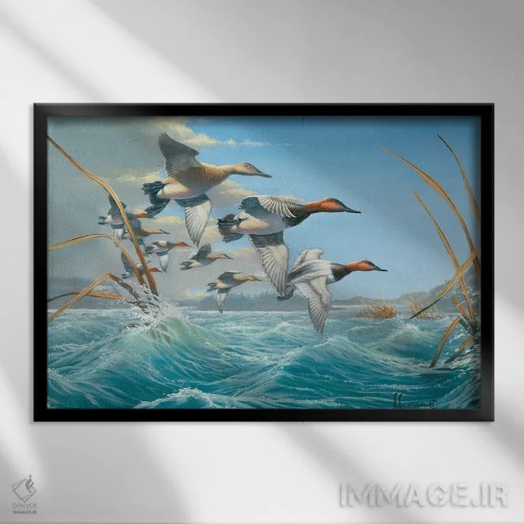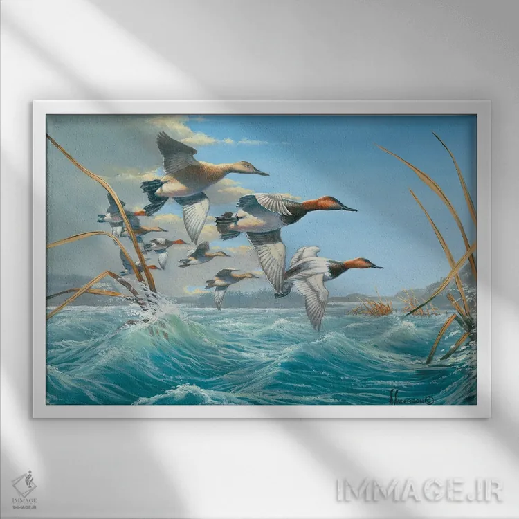 اگر میخواهید دیوار کمی سرزندگیِ محترمانه داشته باشد، «اردکهای کانواسبک در آب متلاطم» اثرِ «اندِرسون آرت (گروه هنری)» بافت و جزئیات را طوری نشان میدهد که نگاه میماند، برای دکورهایی با رنگهای خنثی گزینهٔ مناسبیست. با نورپردازی نقطهای، جذابتر هم میشود.