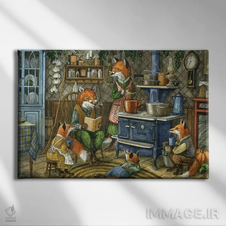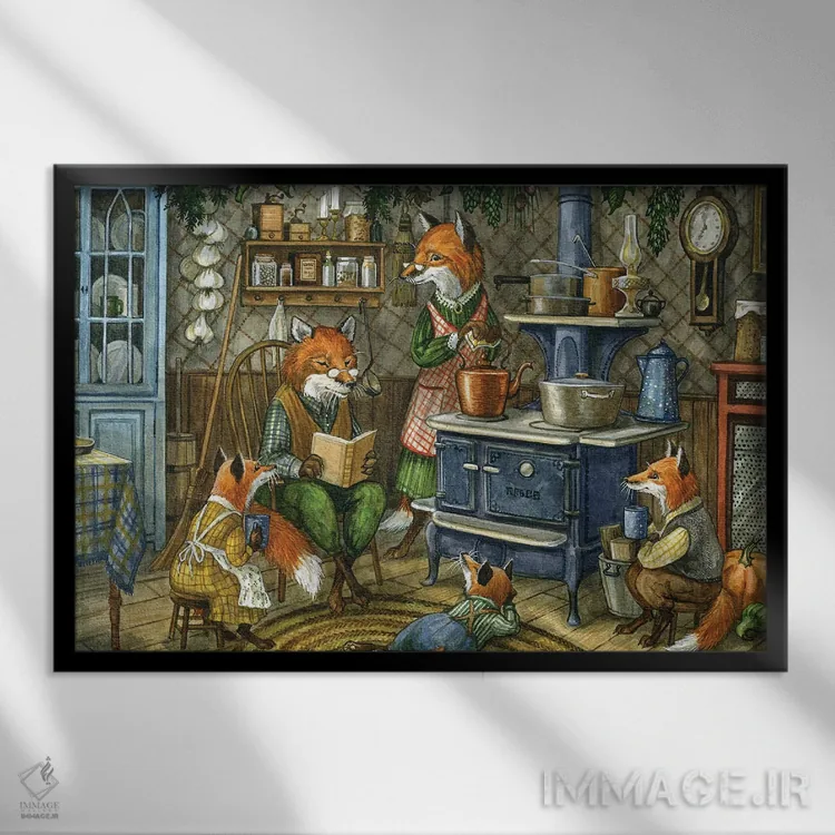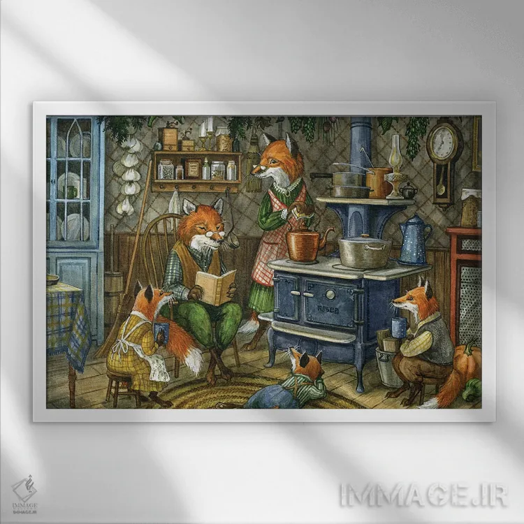 برای دیواری که میخواهید سلیقهتان را آرام و دقیق نشان بدهد، «قصهها کنار اجاق» اثرِ «آسترید شِکلز» جلوهٔ رنگها را طبیعیتر و متعادلتر نشان میدهد؛ برای کنار کتابخانه یا میز کار پیشنهاد میشود. با مبلمان خنثی، تضاد دلنشینی میسازد.