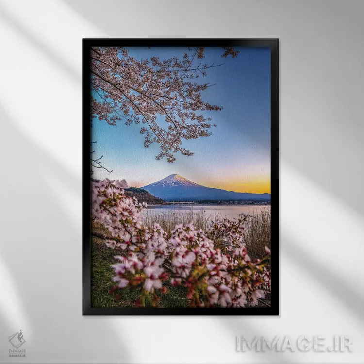 تابلو Lake Kawaguchi II,منظره کوه فوجی از میان درختان شکوفه گیلاس کنار دریاچه کاواگوچی (۲) اثر الکس جی پرز - نمای قاب‌دار مشکی