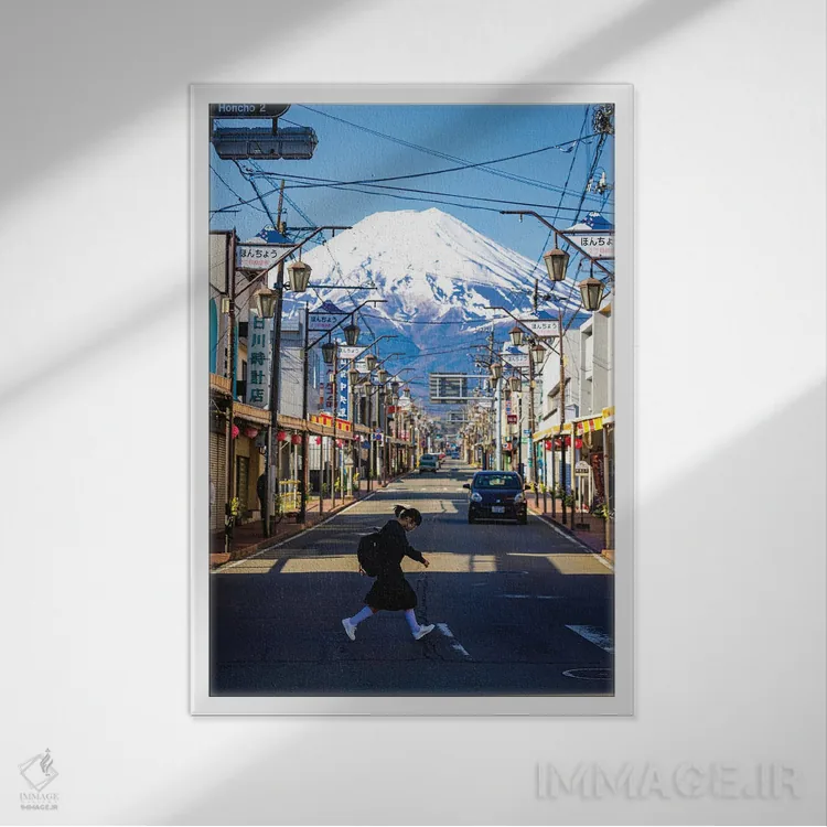 تابلو Japan II,منظره کوه فوجی از میان خیابان‌های فوجینومیا، ژاپن (۲) اثر الکس جی پرز - نمای قاب‌دار سفید