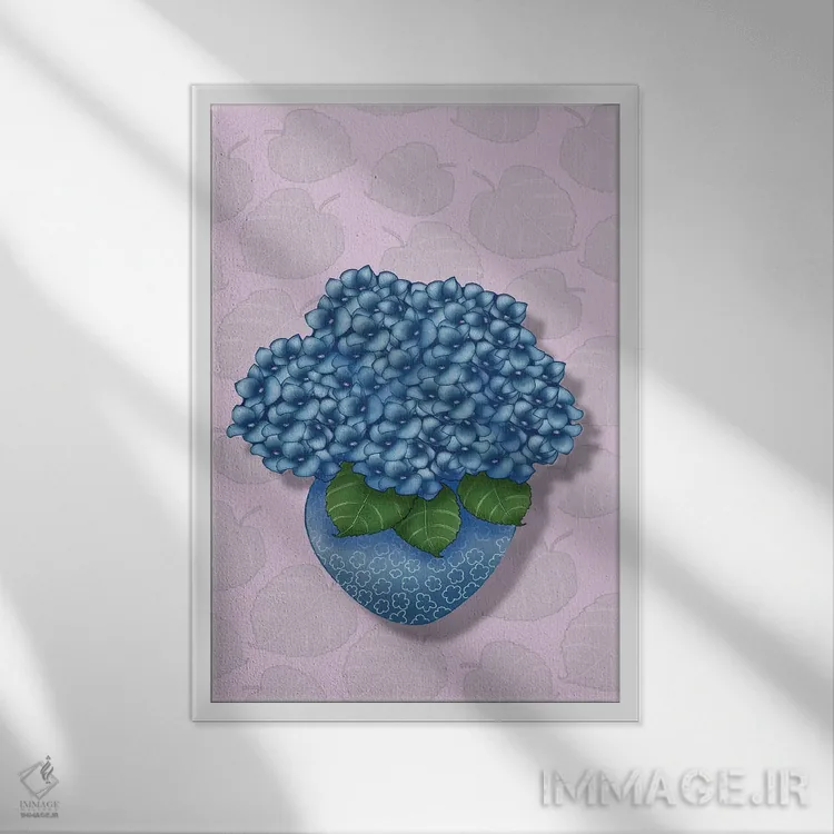 تابلو هورتانسیا در گلدان آبی اثر آن هاچینسون - نمای قاب‌دار سفید