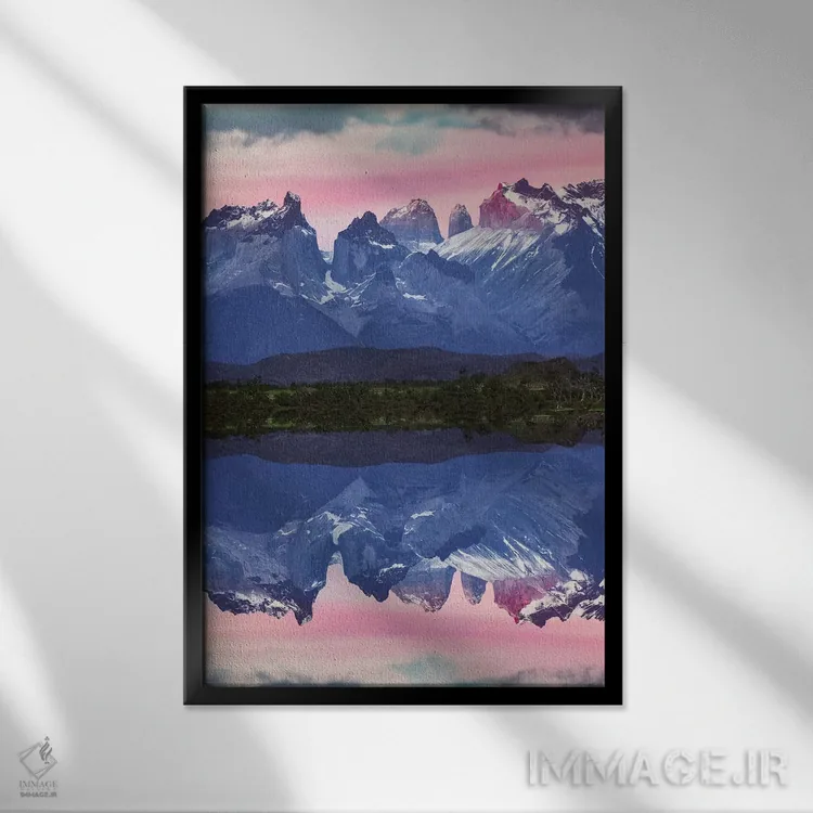 تابلو انعکاس کوهستان پائینه در غروب، پارک ملی تورس دل پائینه، شیلی، پاتاگونیا اثر آدام جونز - نمای روبه‌رو روی دیوار