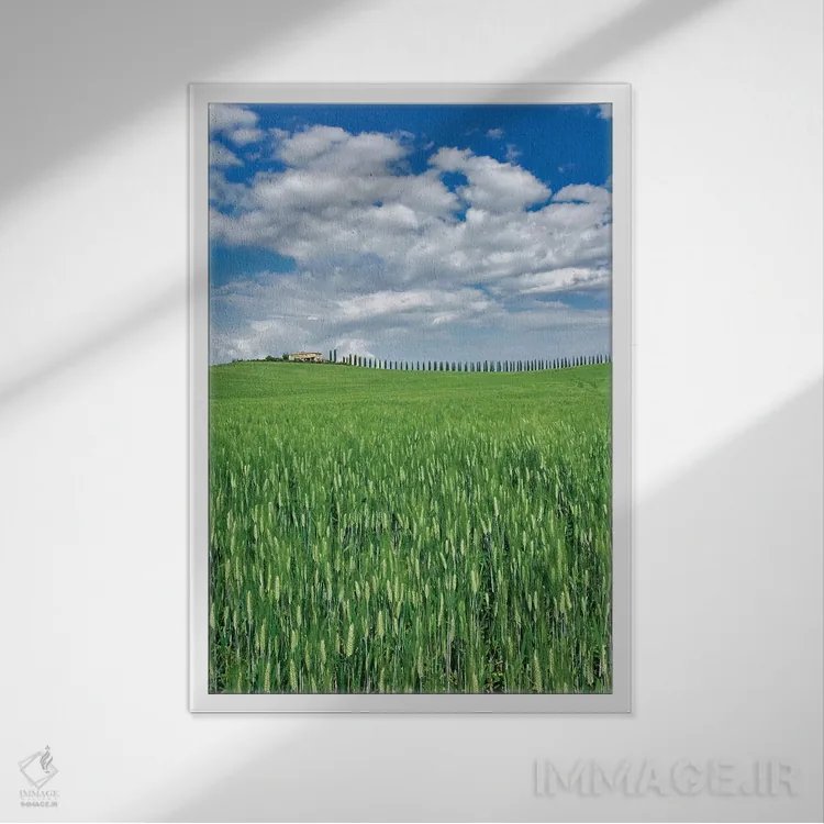 اگر به دکورهای طبیعی علاقه دارید، «مزرعه گندم و جادهای پوشیده از سروهای باشکوه، توسکانی، ایتالیا» اثرِ «آدام جونز» حس طراوت را بدون شلوغی وارد اتاق میکند، برای راهروهای مینیمال گزینهٔ مناسبیست. حضورش آرام است، اما بیاثر نیست.