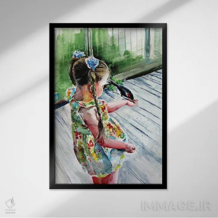 تابلو دختر با پرنده اثر آنا بریجیتا کوواچ - نمای قاب‌دار مشکی