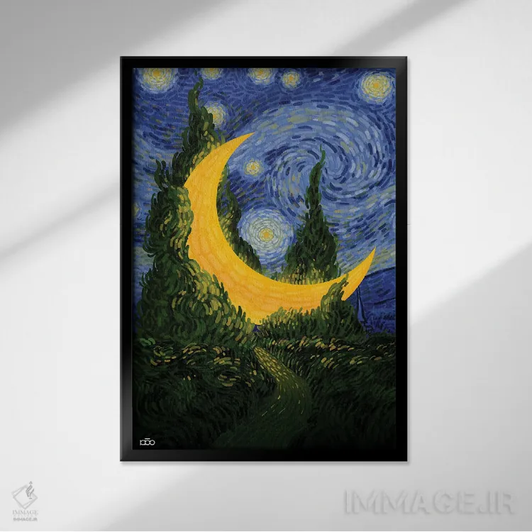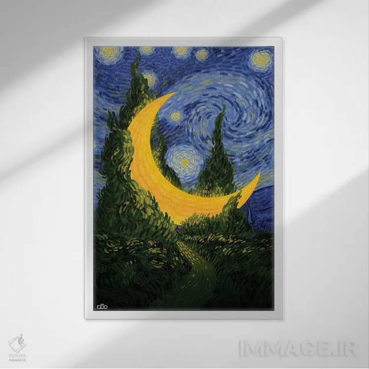 اگر دوست دارید دیوار روشنتر و آرامتر دیده شود، «ماه و سرو» اثرِ «علیرضا کریمی مقدم (هنرمند ایرانی)» در کنار چوب و پارچههای روشن، عالی مینشیند، برای کنار میز آرایش یا کنسول گزینهٔ مناسبیست. با قاب روشن یا چوبی، حس طبیعیتری پیدا میکند.