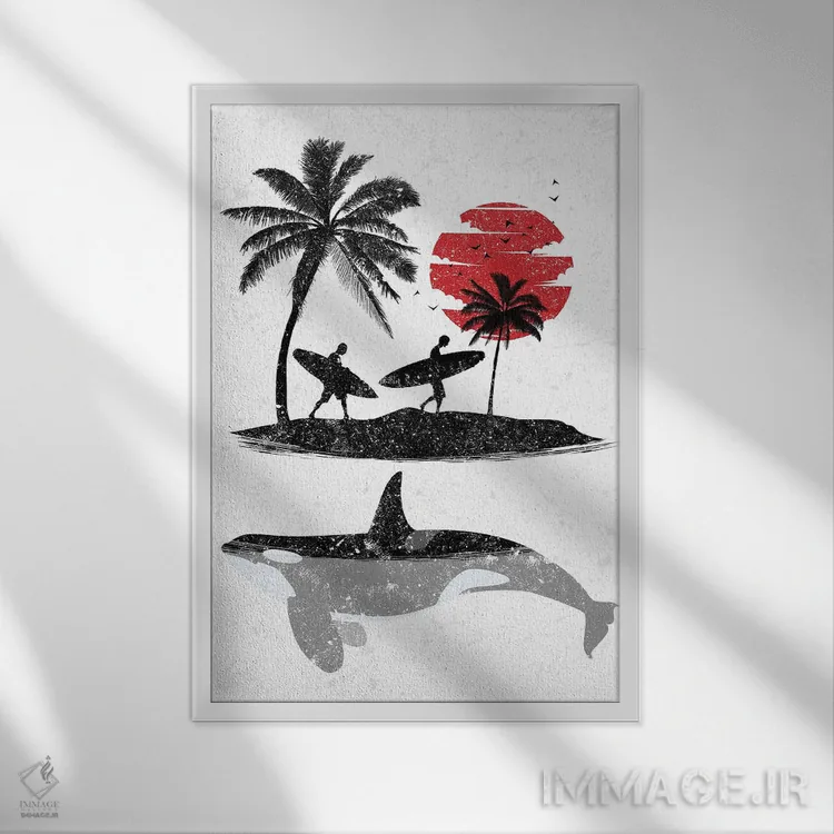 تابلو نهنگ قاتل موج‌سوار جزیره اثر آلبرتو پرز - نمای قاب‌دار مشکی