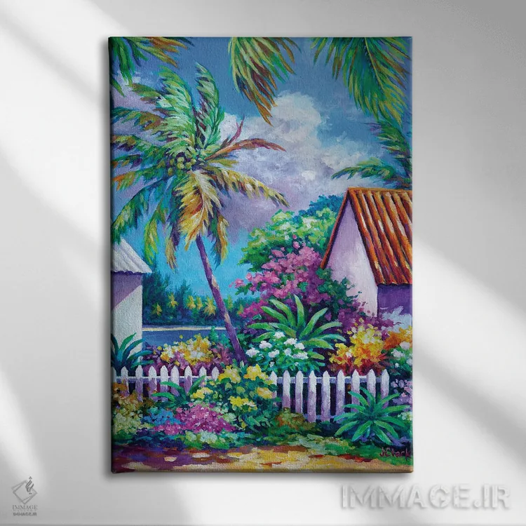 «باغ در کیمن کای» اثرِ «جان کلارک» در فضای دکور ساحلی، کنار پارچههای روشن و اکسسوریهای طبیعی (حصیر/چوب) عالی هماهنگ میشود.
