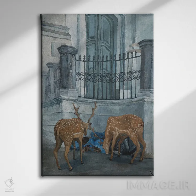 «گوزنهای سرگردان در سانتو آنتونیو» اثرِ «آرتور ریو» با رویکرد هنری و موضوعِ این اثر، حسِ گالریوار و مرتب به فضا میدهد؛ مناسبِ پذیراییهای کلاسیک و معاصر.