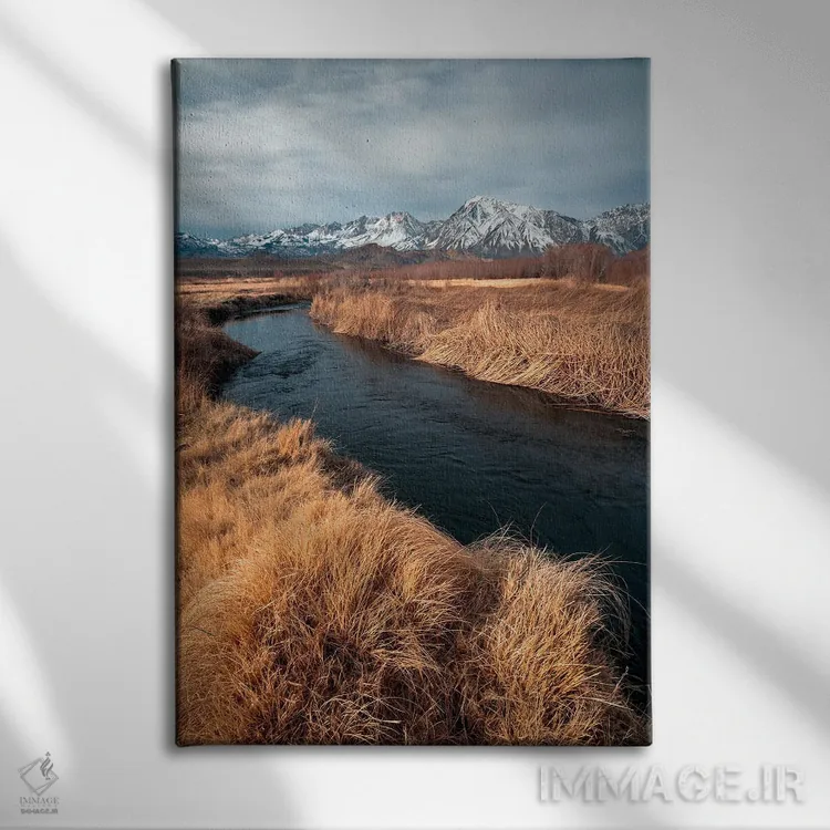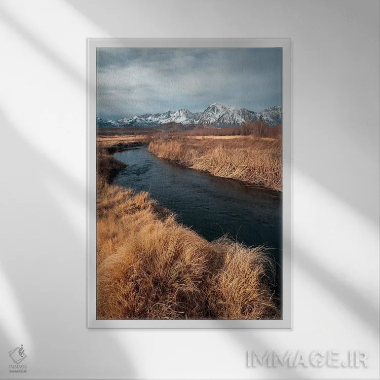 تابلو رودخانه اوونز با پس‌زمینه‌ی کوه‌های سیرا شرقی اثر الکساندر اسلاوتسکی - نمای قاب‌دار سفید
