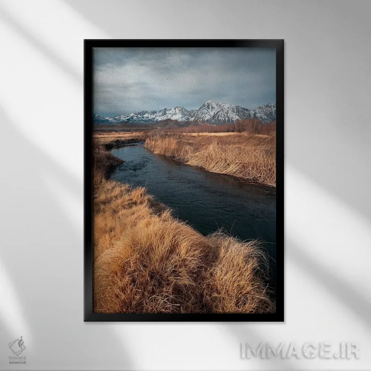 تابلو رودخانه اوونز با پس‌زمینه‌ی کوه‌های سیرا شرقی اثر الکساندر اسلاوتسکی - نمای قاب‌دار مشکی