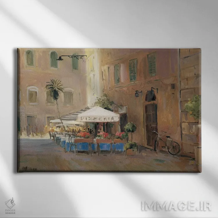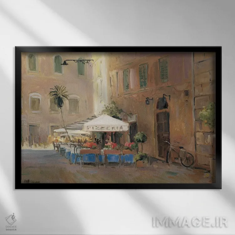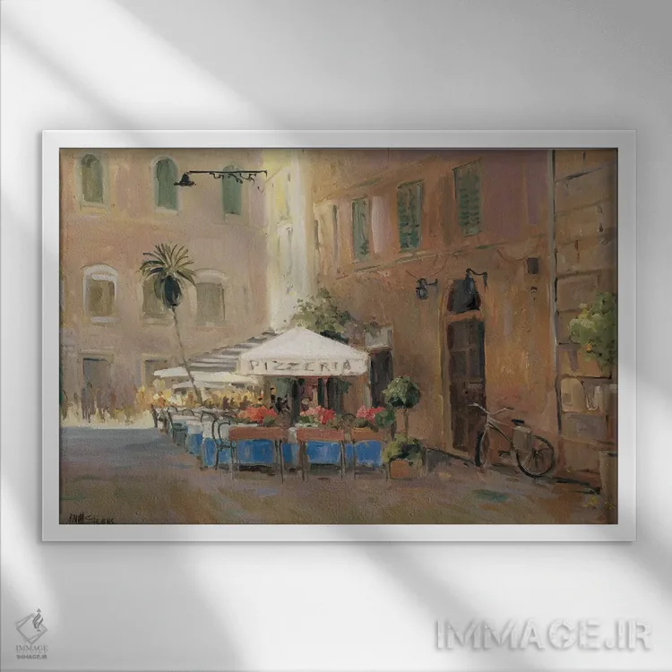 «کافهٔ رم (ایتالیا)» اثرِ «الین استیونز» از آن قابهایی است که کنار رنگهای خاکی و کرم، زیباتر دیده میشود؛ موضوعِ این اثر هم حسِ بهاری میدهد.