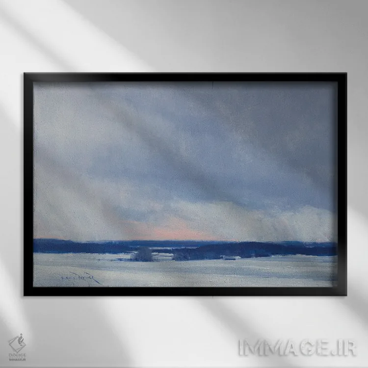 براساس پالت سرد اثر، قاب سفید مات (فریم باریک) پیشنهاد اول است و نقرهای برسخورده (متالیک) مکمل. برای سفارشهای پروژهای با ابعاد و قابهای اختصاصی با ایماژ در تماس باشید.