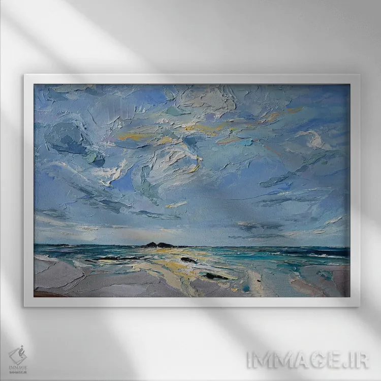 براساس پالت سرد اثر، قاب سفید مات (فریم باریک) پیشنهاد اول است و نقرهای برسخورده (متالیک) مکمل. برای سفارشهای پروژهای با ابعاد و قابهای اختصاصی با ایماژ در تماس باشید.