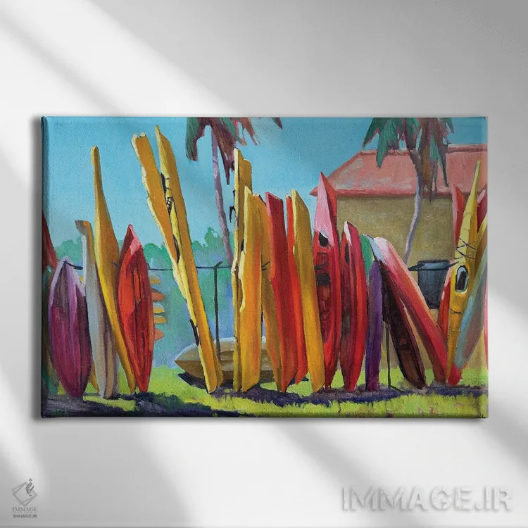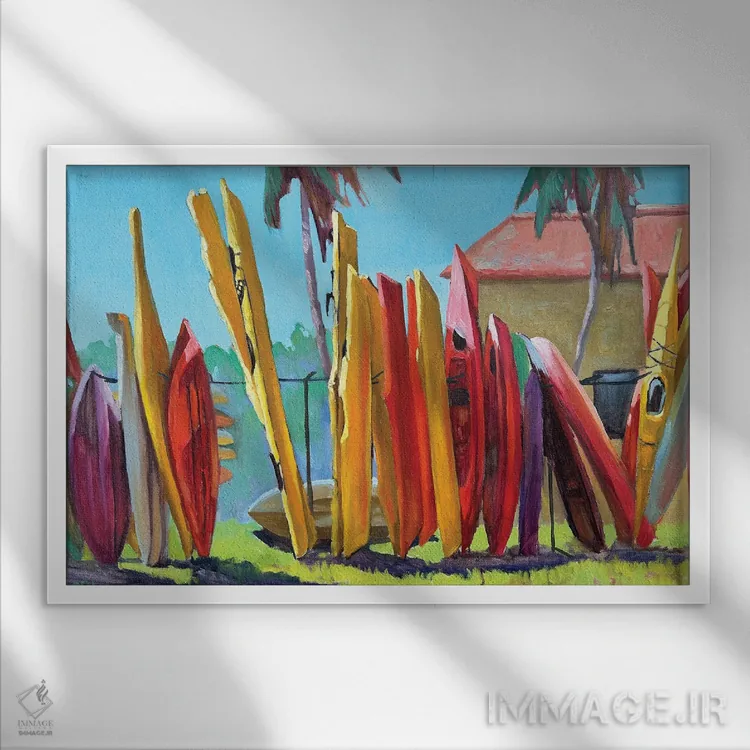 «کایاکهای زرد» اثرِ «آنا بوگوشفسکایا» با حالوهوای این اثر و لحنِ دکور ساحلی، فضا را روشنتر و سبکتر نشان میدهد—مناسبِ نشیمنهای آفتابگیر.