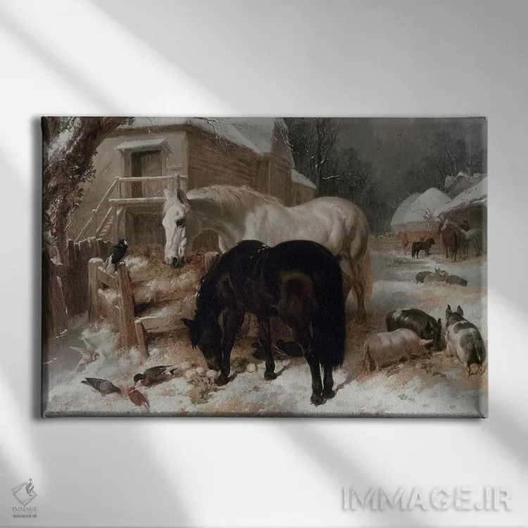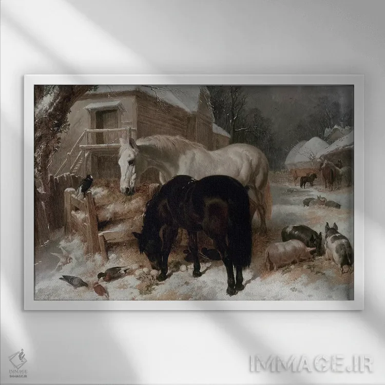 این اثر با عنوان «صحنه حیاط مزرعه» اثرِ «جان فردریک هرینگ سینیور» در کنار رنگهای خنثی، تضاد دلچسبی میسازد؛ برای کافههای کوچک و صمیمی انتخابی خوشسلیقه است. هم فضا را گرم میکند، هم شلوغش نمیکند.