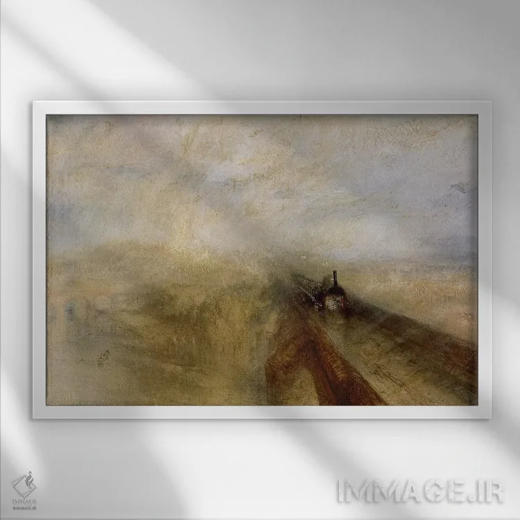 تابلو باران، بخار و سرعت، راه‌آهن بزرگ غربی، کشیده‌شده پیش از ۱۸۴۴ اثر جی.ام.دبلیو. ترنر (نقاش بزرگ انگلیسی) - نمای قاب‌دار سفید