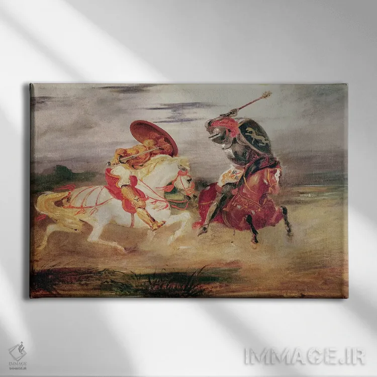 اگر به قابهای رسمی و گالریپسند علاقه داری، «دو شوالیه در حال نبرد در منظره، حدود ۱۸۲۴» اثرِ «فرباوراند ویکتور اوژن دلاکروا (نقاش فرانسوی)» با موضوعِ این اثر در فضای فاخر کلاسیک گزینهی مطمئنی است.