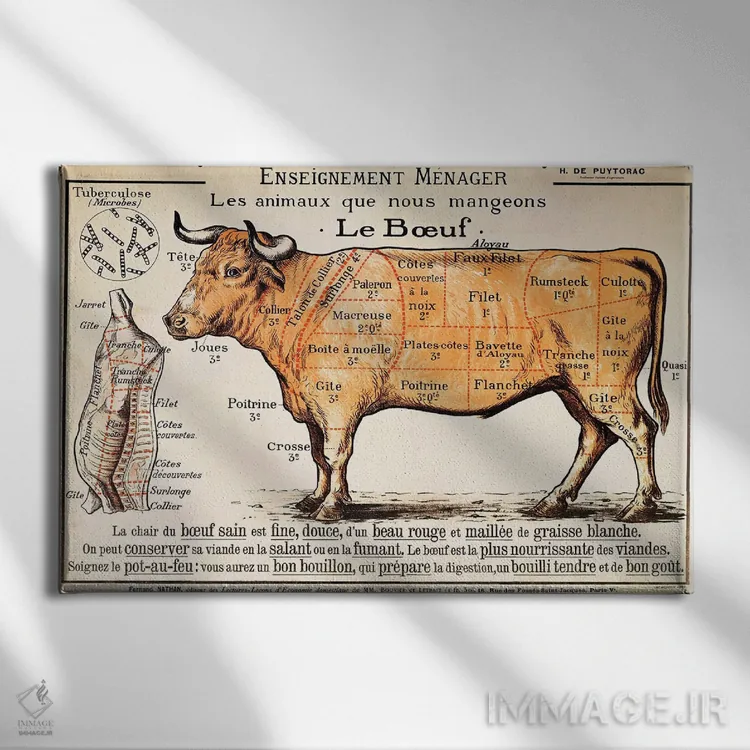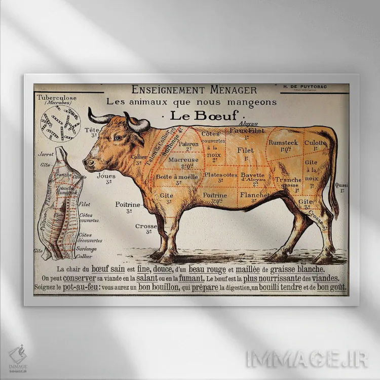 برای اتاقی که به یک عنصر دوستداشتنی نیاز دارد، «گوشت گاو: نمودار قطعات مختلف گوشت» اثرِ «مکتب فرانسوی (سبک یا جریان هنری)» مثل یک امضای بامزه اما متین عمل میکند؛ برای فضاهای روستیک یا بوهو انتخابی خوشسلیقه است. هر بار نگاهش میکنید، یک جزئیات تازه به چشم میآید.