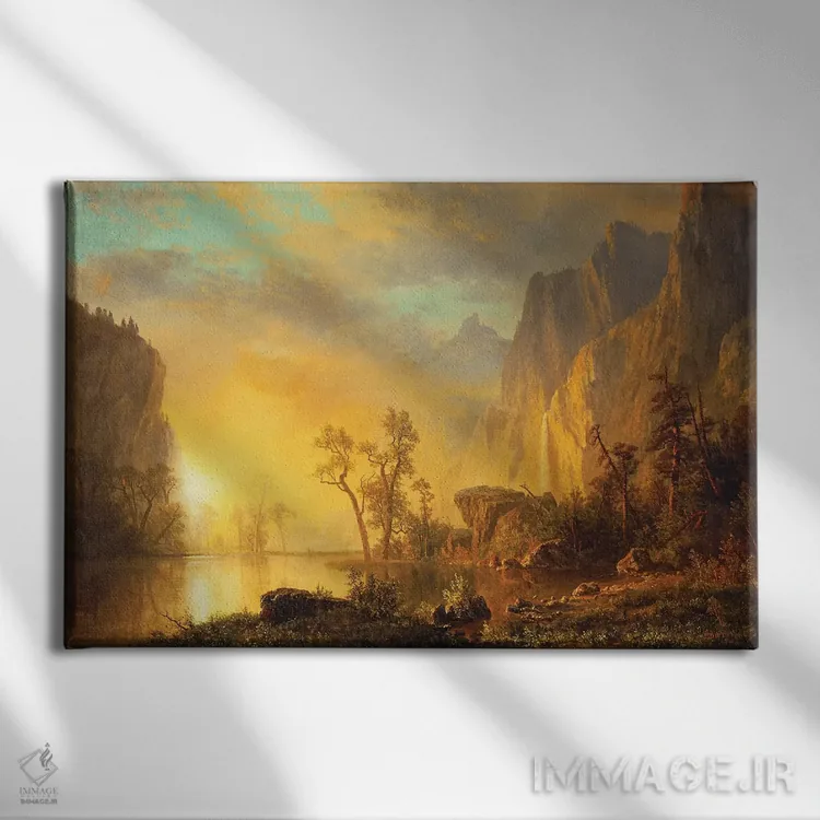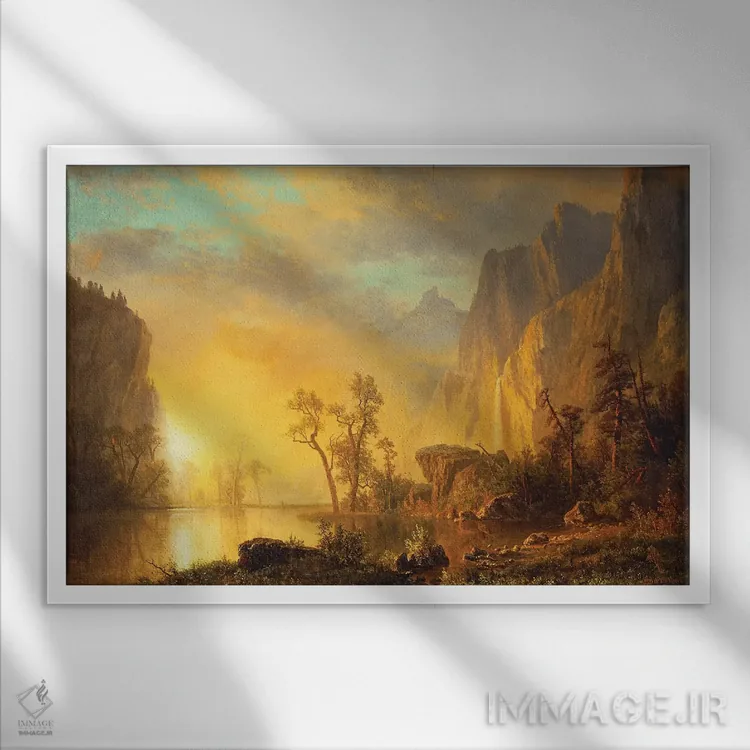 اگر به قابهای رسمی و گالریپسند علاقه داری، «غروب در کوههای راکی» اثرِ «آلبرت بیرشتات (نقاش منظره آمریکایی)» با موضوعِ این اثر در فضای فاخر کلاسیک گزینهی مطمئنی است.