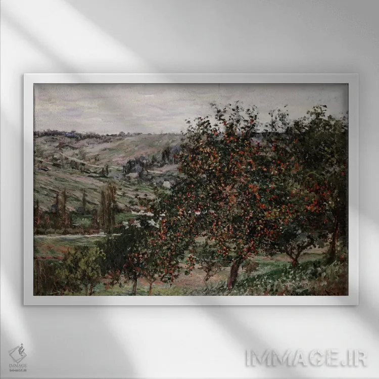 تابلو درختان سیب نزدیک وته‌وی اثر کلود مونه (نقاش معروف فرانسوی) - نمای قاب‌دار سفید