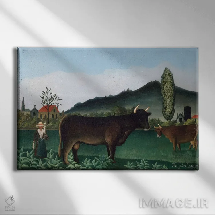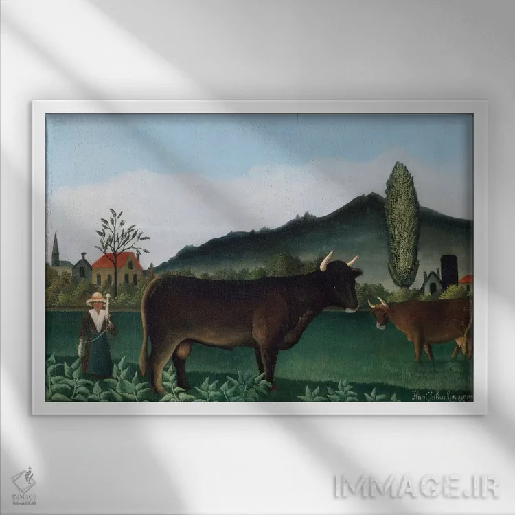 در «منظره با گاو، ۱۸۸۶» اثرِ «آنری روسو»، حضور حیوانات حس طبیعت را بیدغدغه وارد خانه میکند؛ برای راهروها و ورودیهای گرم انتخابی خوشسلیقه است. هم فضا را گرم میکند، هم شلوغش نمیکند.