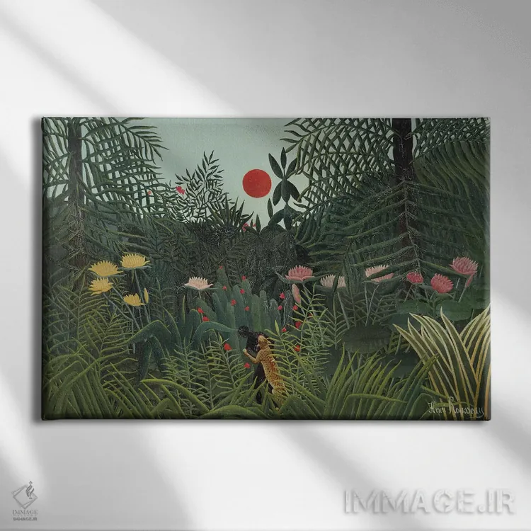 اگر میخواهید دیوار کمی سرزندگیِ محترمانه داشته باشد، «حمله یوزپلنگ (غروب جنگل)، ۱۹۱۰» اثرِ «آنری روسو» مثل یک امضای بامزه اما متین عمل میکند، برای فضاهای روستیک یا بوهو گزینهٔ مناسبیست. حسش صمیمی است، اما کیفیتش جدی و خوشپرداخت.